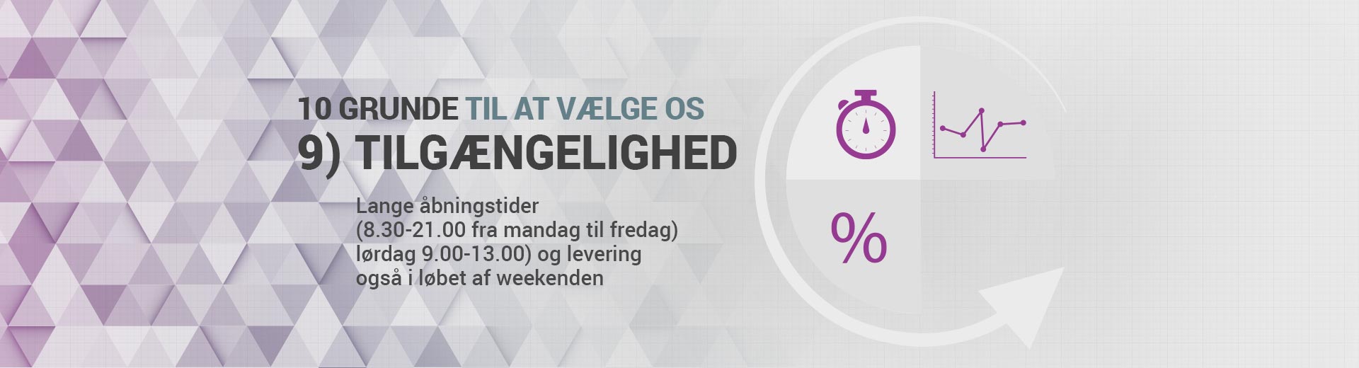 Lange åbningstider (8.30-18.30 fra mandag til fredag) og levering også i løbet af weekendenFULDSTÆNDIG ASSISTANCE