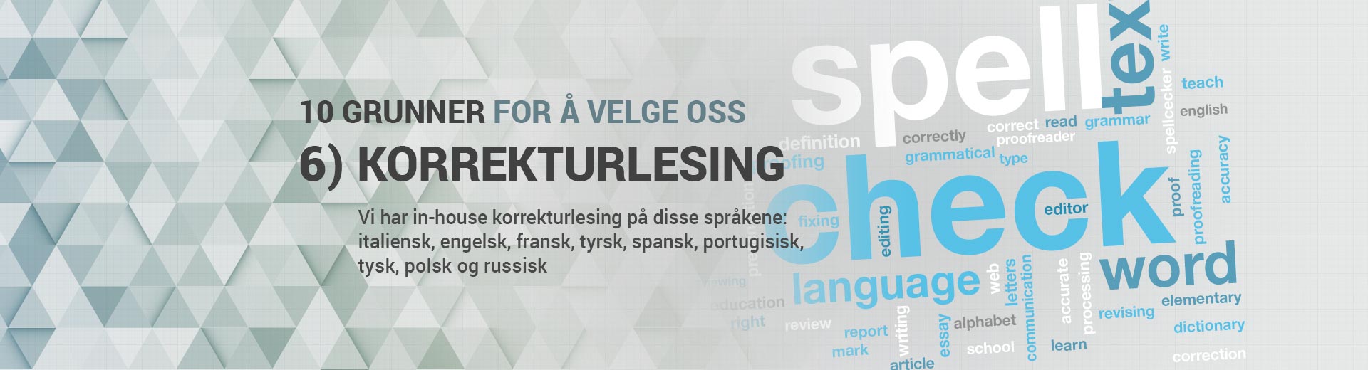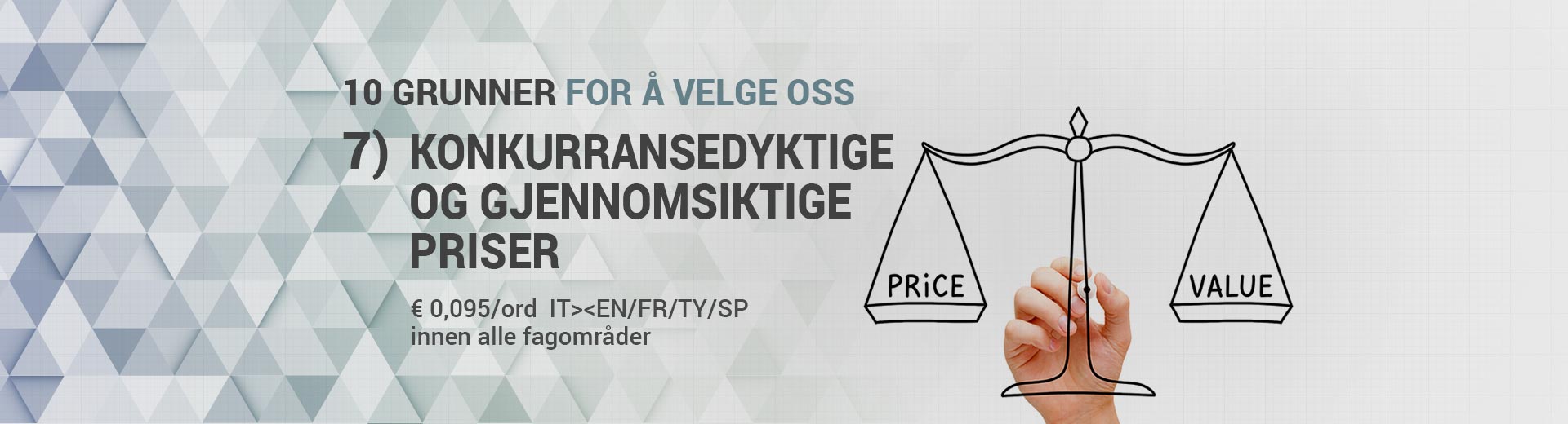 Vi har in-house korrekturlesing på disse språkene: Italiensk, engelsk, fransk, tyrsk, spansk, portugisisk, tysk, polsk og russiskKONKURRANSEDYKTIGE OG GJENNOMSIKTIGE PRISER
