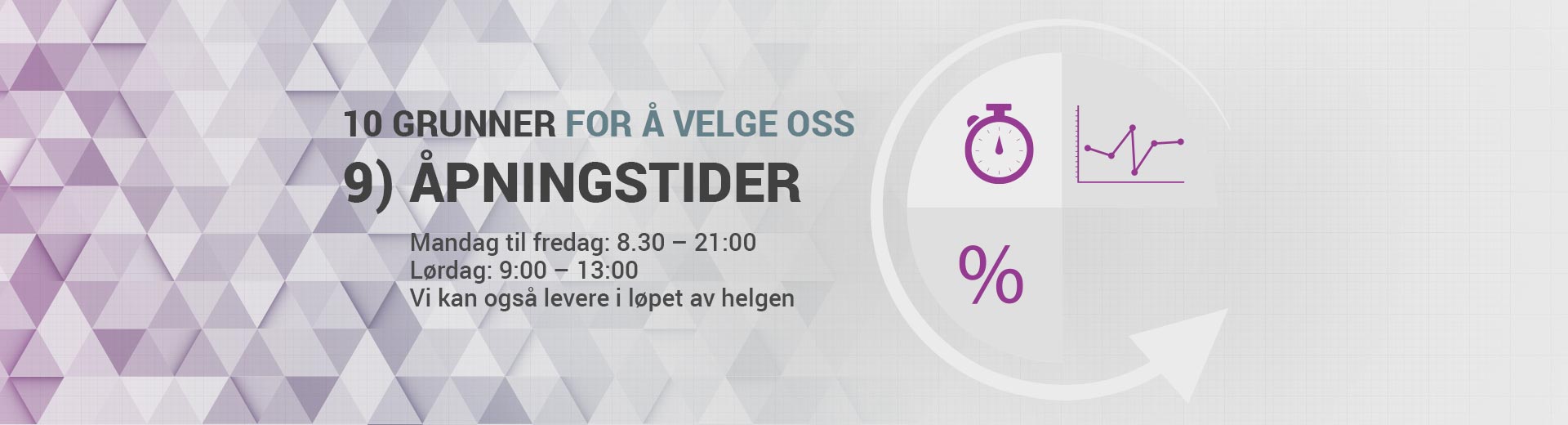 Vi stenger ikke for lunsjpause (8.30-18.30 fra mandag til fredag) og kan levere også i løpet av helgenFULL SERVICE