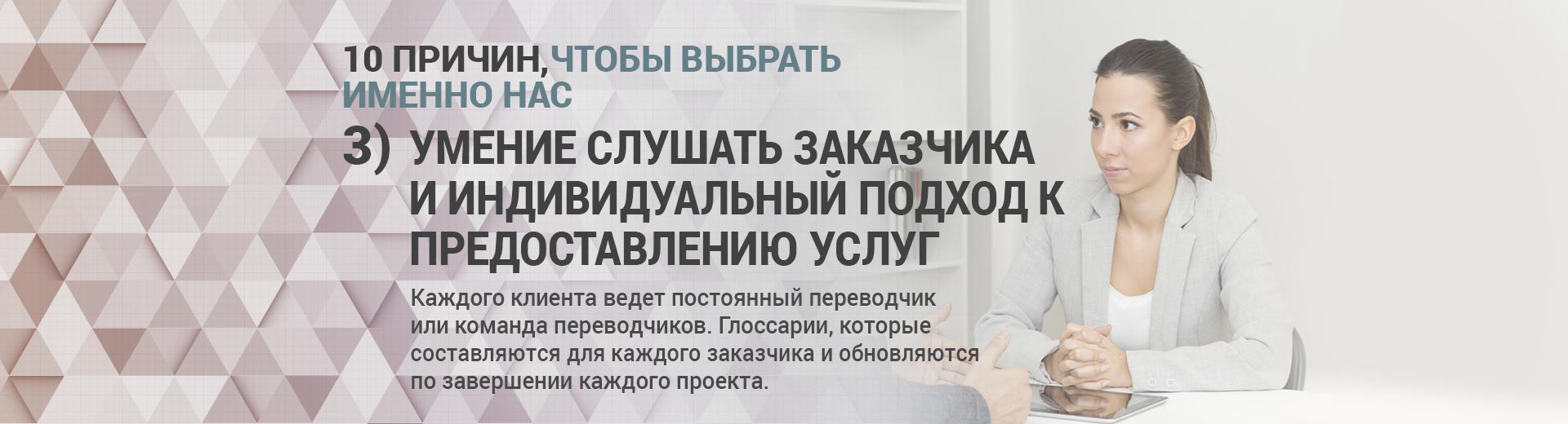 Каждого клиента ведет постоянный переводчик или команда переводчиков.Глоссарии, которые составляются для каждого заказчика и обновляются по завершении каждого проекта.
