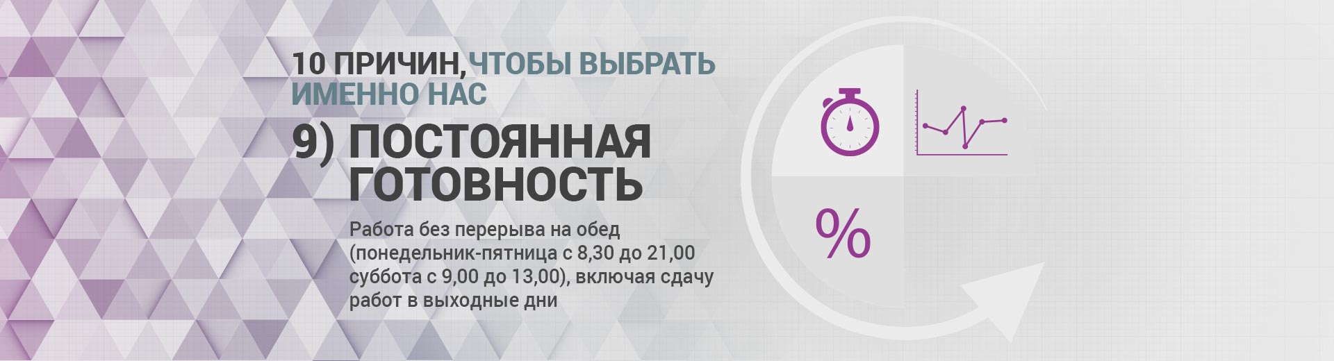 Своевременная сдача работ в сжатые сроки, которые обязательно согласуются с заказчикомПОСТОЯННАЯ ГОТОВНОСТЬ