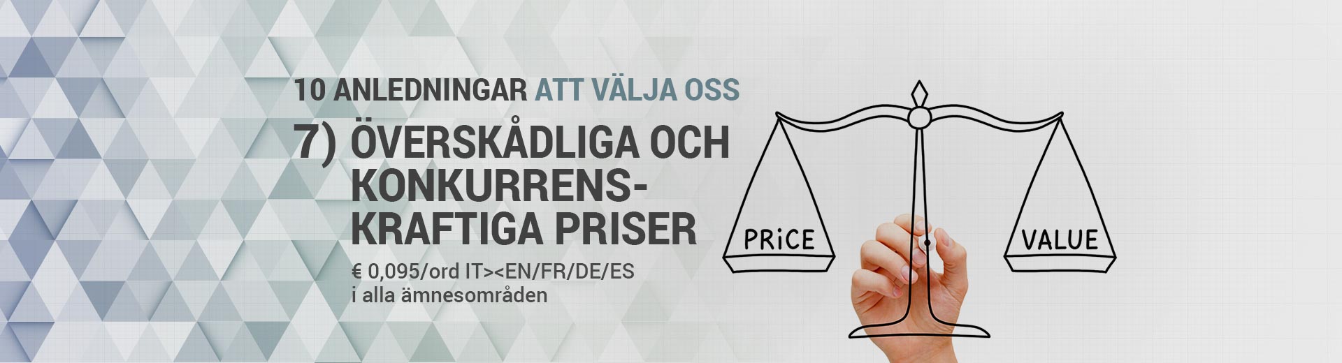 Språken som granskas internt är italienska, engelska, franska, tyska, spanska, portugisiska, polska och ryskaÖVERSKÅDLIGA OCH KONKURRENSKRAFTIGA PRISER