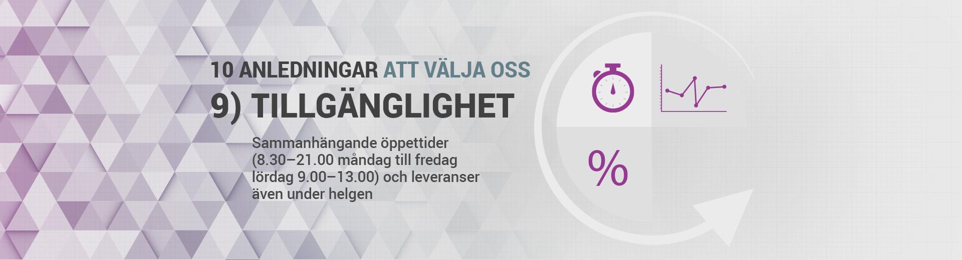 Sammanhängande öppettider (8.30–18.30 måndag till fredag) och leveranser även under helgenKOMPLETT SERVICE