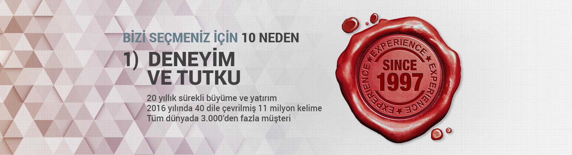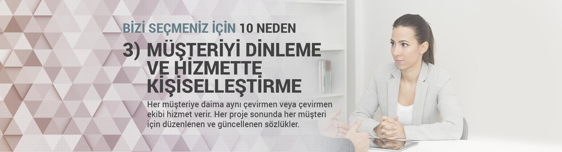 Her müşteriye daima aynı çevirmen veya çevirmen ekibi hizmet verir.Her proje sonunda her müşteri için düzenlenen ve güncellenen sözlükler.